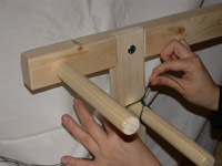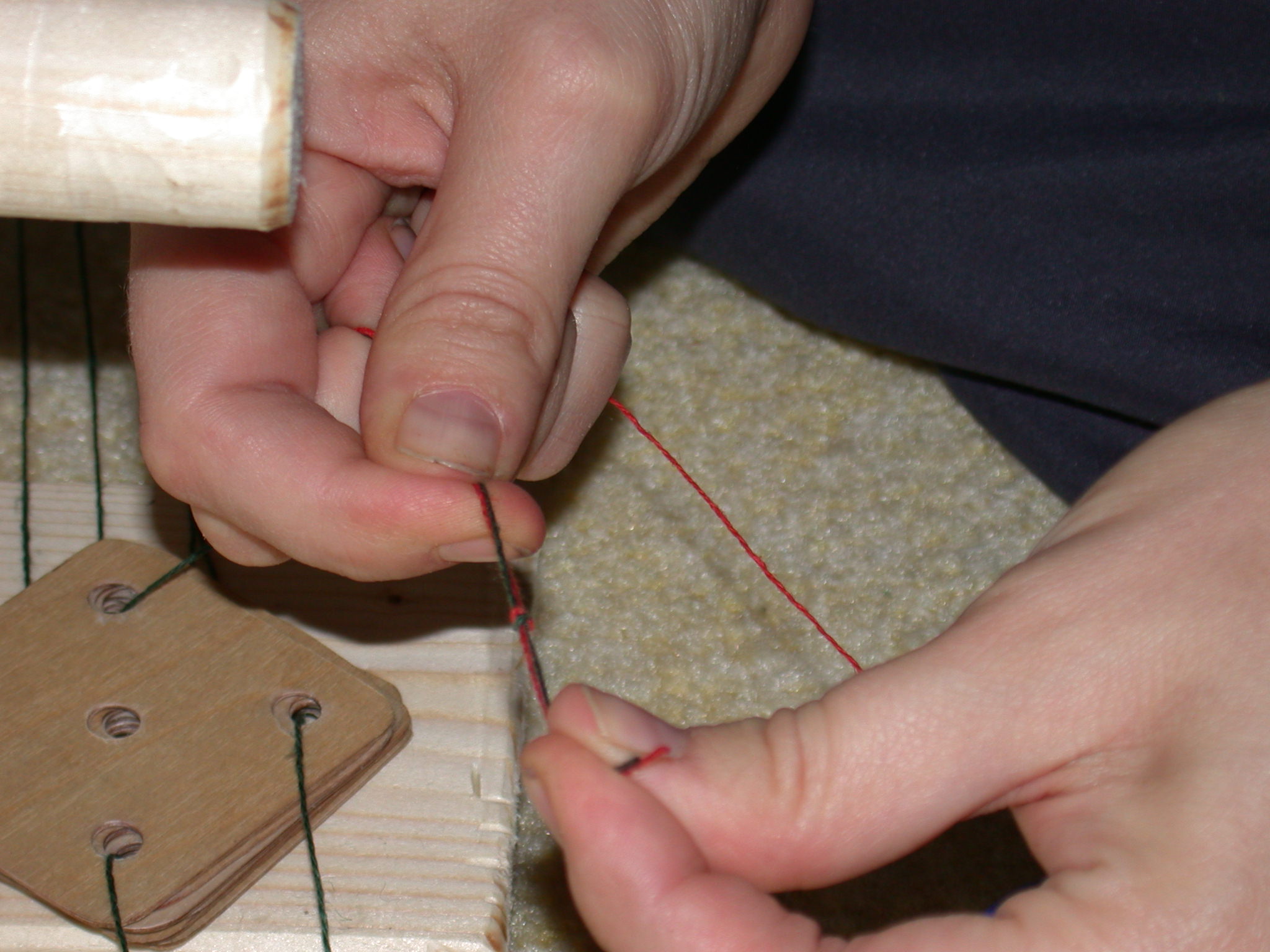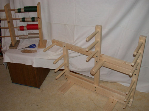 Dafür braucht man neben den schon in der Anleitung beschriebenen Dingen entweder mindestens zwei Schraubzwingen, die man z.B. an zwei gegenüberliegenden Enden eines Tisches befestigt, einen Schärrahmen oder einen Webrahmen.