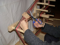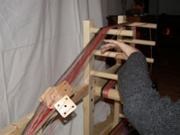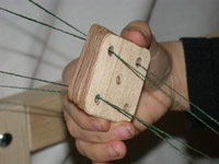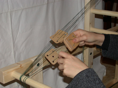 Der Endloseinzug ist eine praktische und zeitsparende Methode, ein Band zu schären. Ich habe sie auf dem Webertreffen 2002 in Dalheim von Ilona Gehlhaar gezeigt bekommen. Entgegen der üblichen Methode spart man erheblich Zeit, v.a. bei Mustern, bei denen der Großteil der Brettchen gleich bezogen ist.