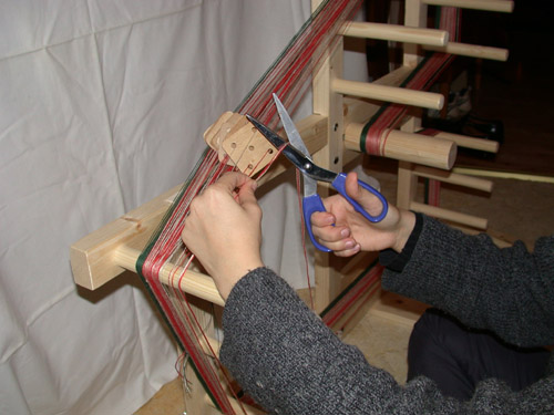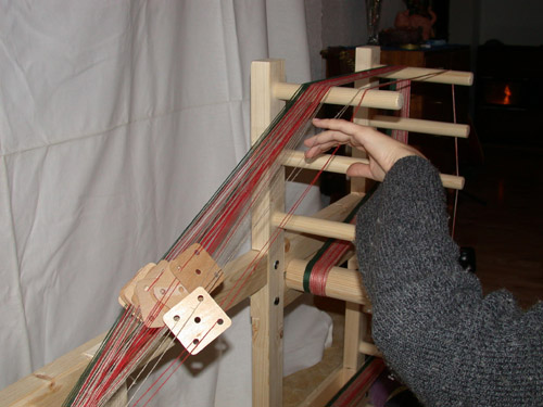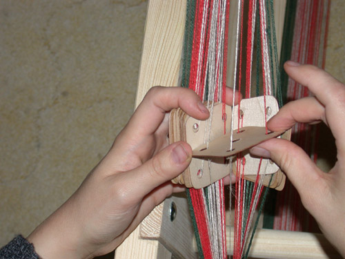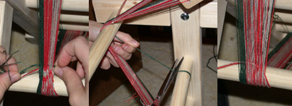 Arbeitet man direkt am Webrahmen, sollte man sich klar sein, dass sich das Band durch das Weben verkürzt. Daher muss man darauf achten, dass die Spannung später immer noch mal nachgegeben werden kann. Also, die Spannvorrichtung so groß wie möglich aufziehen.
