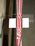 Da man bei dieser Bezugsmethode nicht Brettchen für Brettchen Loch für Loch bezieht, sondern abgemessen große Garnknäuel pro bezogenes Loch in der jeweiligen Farbe. In unserem Beispielband sehen wir einfarbige Ränder und ein zweifarbiges Mittelteil. Also bräuchten wir für den Rand 4 Knäuel grün - pro mit grün belegtem Loch eines. Für das Mittelteil brauchen wir jeweils 2 Knäuel rot und 2 Knäuel weiß. Wer jetzt aber keine Lust hat, für ein Band eine Riesenmenge Knäuels zu kaufen, der kann von einer dicken Garnrolle die entsprechende Menge abwickeln. Entweder als Knäuel oder auf eine Klopapierrolle.