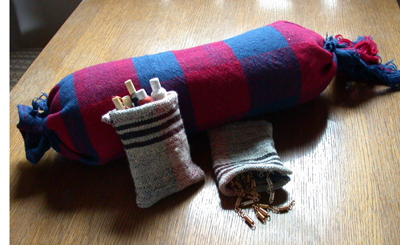 Wieder zuhause, versuchte ich mich in der Vorweihnachtszeit an dem Gatterkammwebrahmen und hatte tatsächlich Erfolg. Etwas getrübt durch eine heftige Erkältung gepaart mit Rückenschmerzen musste ich eine Zwangspause einlegen, aber nach den Weihnachtstagen hatte ich mein erstes Tuch gewebt. Aus diesem wurden die oben abgebildeten Gegenstände.